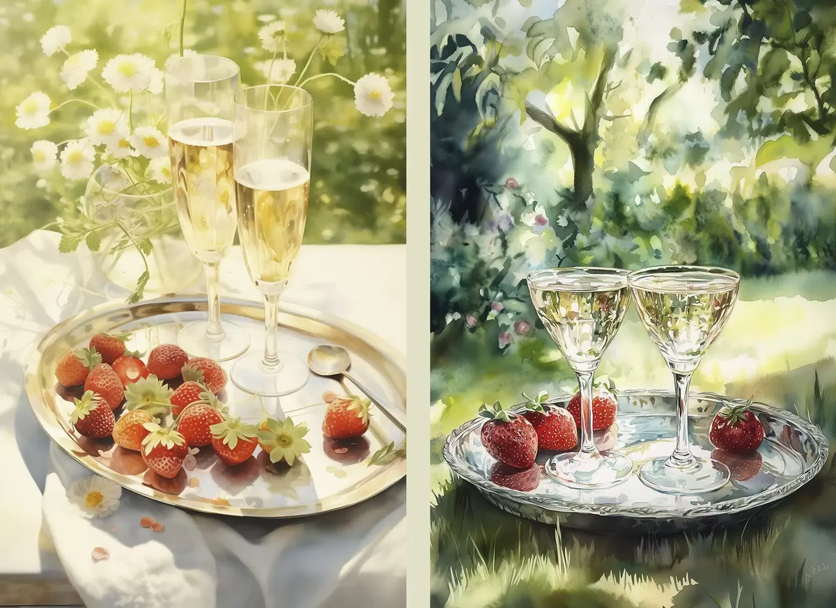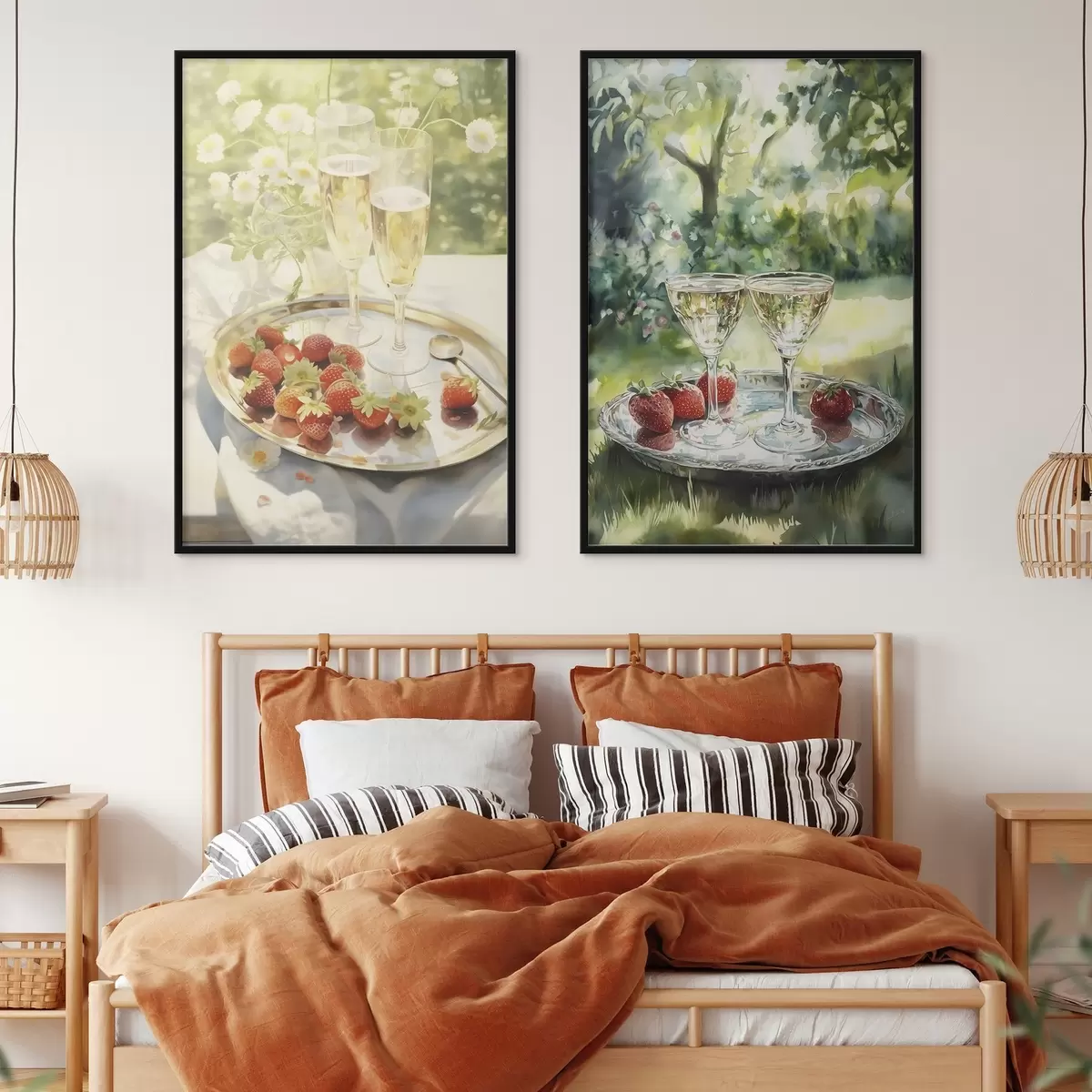 Poster Zomerpicknick, champagneglazen met aardbeien op het dienblad, kamillebloemen N° d00414