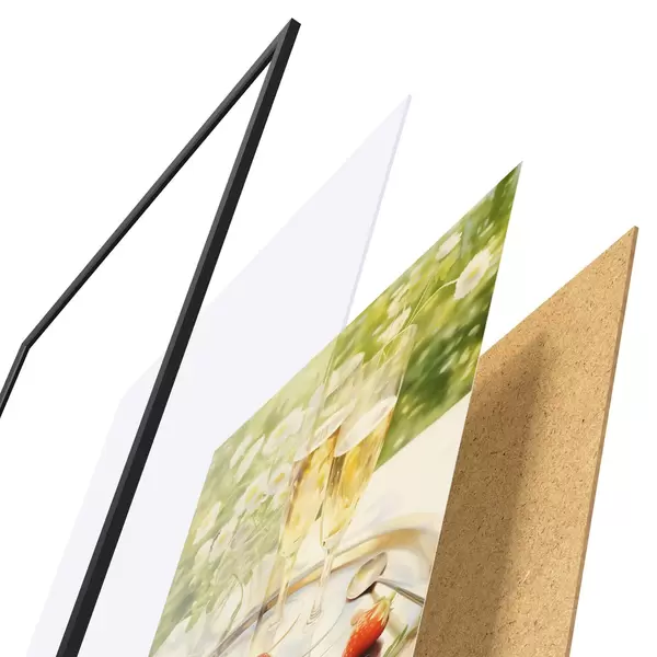 De poster bestaat uit een frame, plexiglas, geprinte afbeelding en spaanplaat achterkant. De poster kan meteen aan de muur worden gehangen dankzij de bevestigingen op de achterkant.