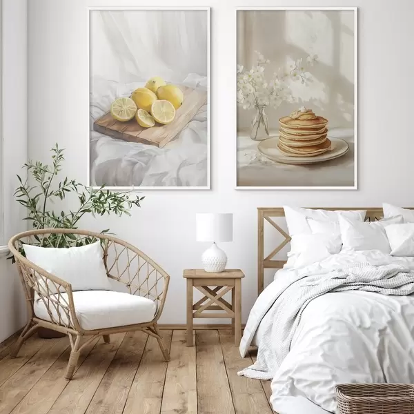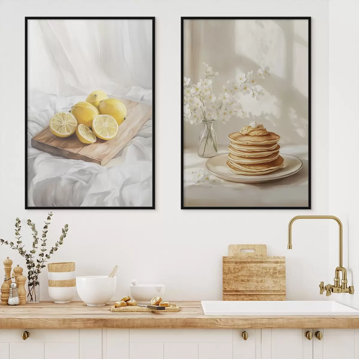 Poster Pannenkoeken met pindakaas, citroenen op de houten plank, aquarelstijl N° d00416
