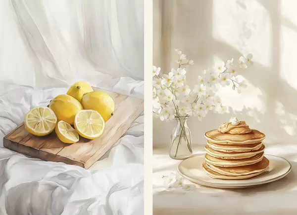 Poster Pannenkoeken met pindakaas, citroenen op de houten plank, aquarelstijl N° d00416