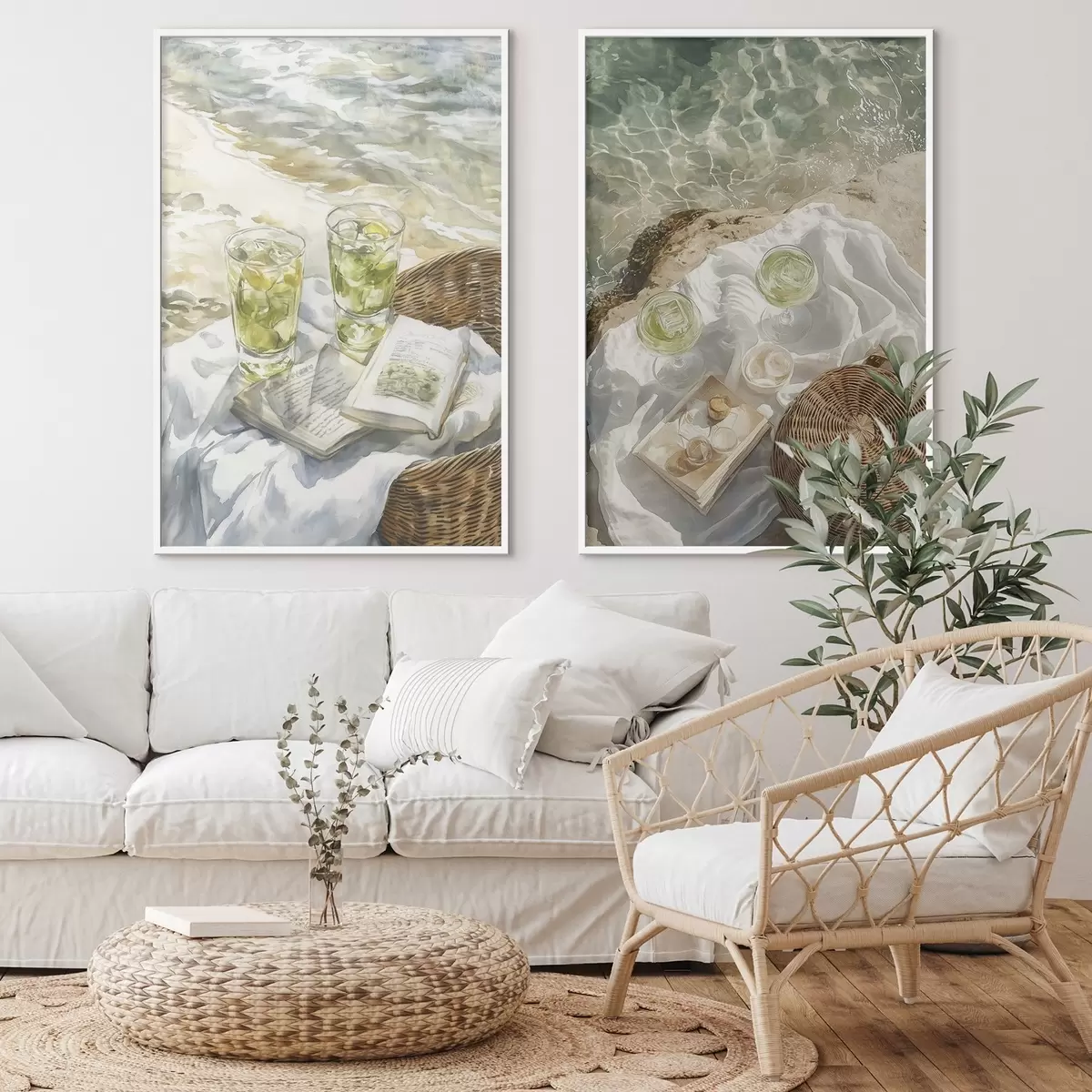 Poster Cocktails op het strand, aquarel tekening, oceaan, zomer picknick d00417