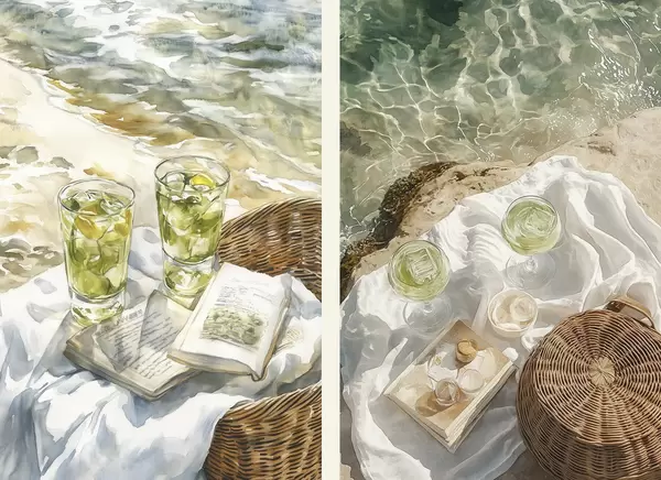 Poster Cocktails op het strand, aquarel tekening, oceaan, zomer picknick N° d00417
