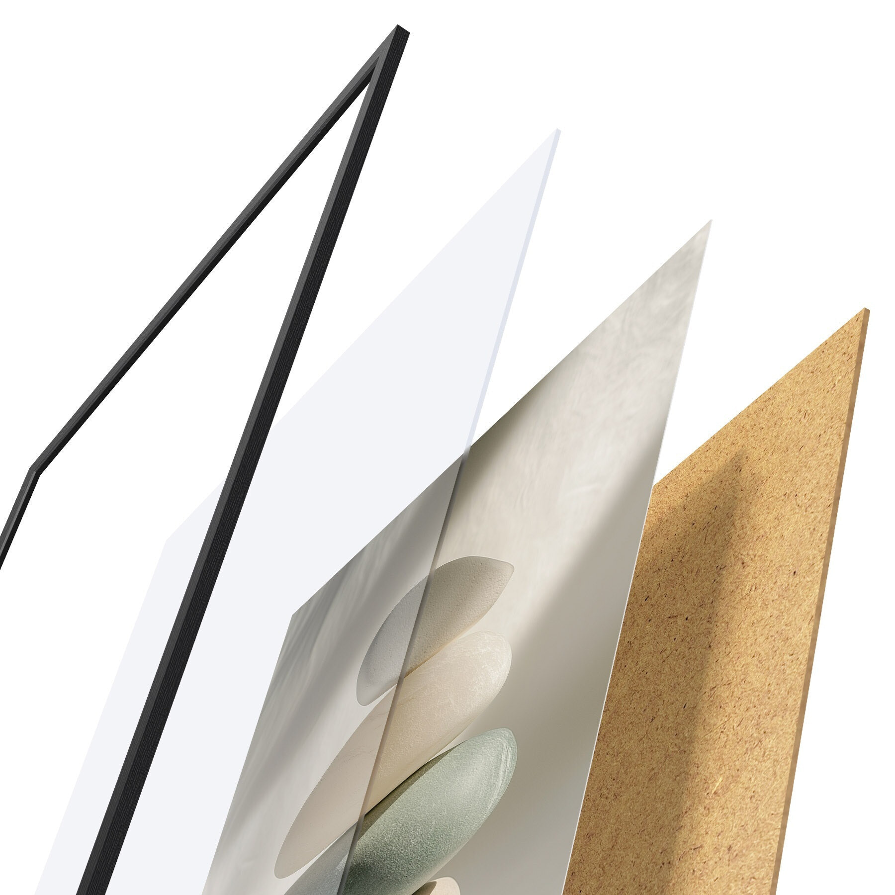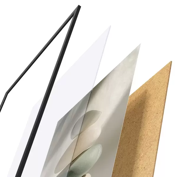 De poster bestaat uit een frame, plexiglas, geprinte afbeelding en spaanplaat achterkant. De poster kan meteen aan de muur worden gehangen dankzij de bevestigingen op de achterkant.