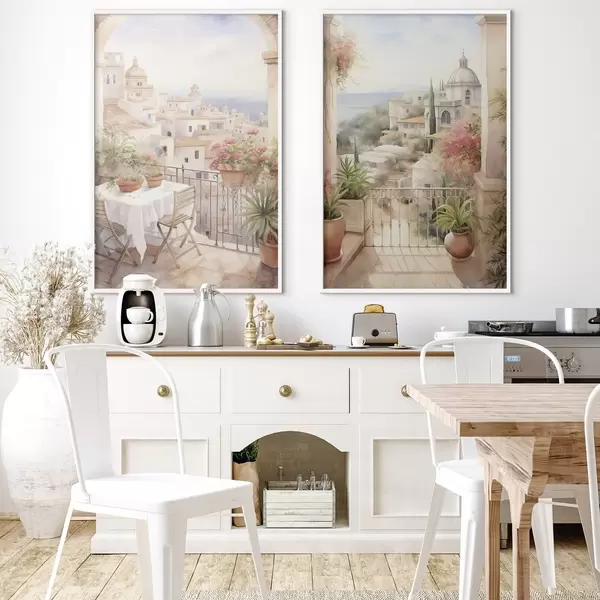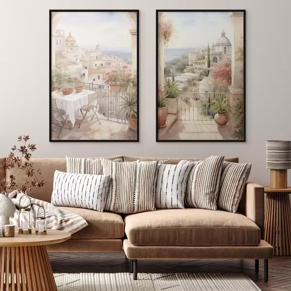 Poster Zonsondergang op het balkon, architectuur, bloeiende bloemen, aquarel stijl, mediterraan N° d00420