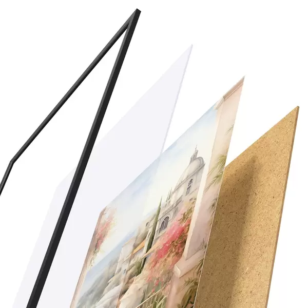 De poster bestaat uit een frame, plexiglas, geprinte afbeelding en spaanplaat achterkant. De poster kan meteen aan de muur worden gehangen dankzij de bevestigingen op de achterkant.