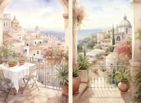 Poster Zonsondergang op het balkon, architectuur, bloeiende bloemen, aquarel stijl, mediterraan N° d00420