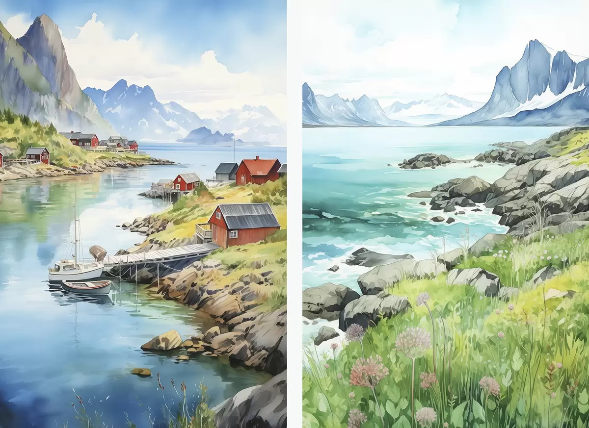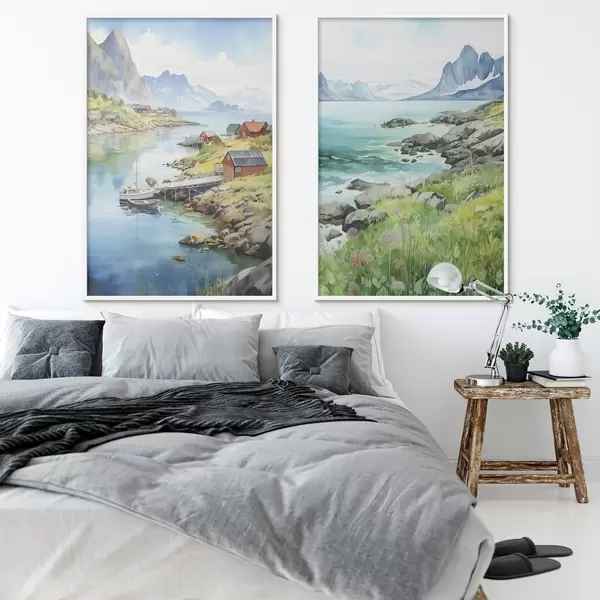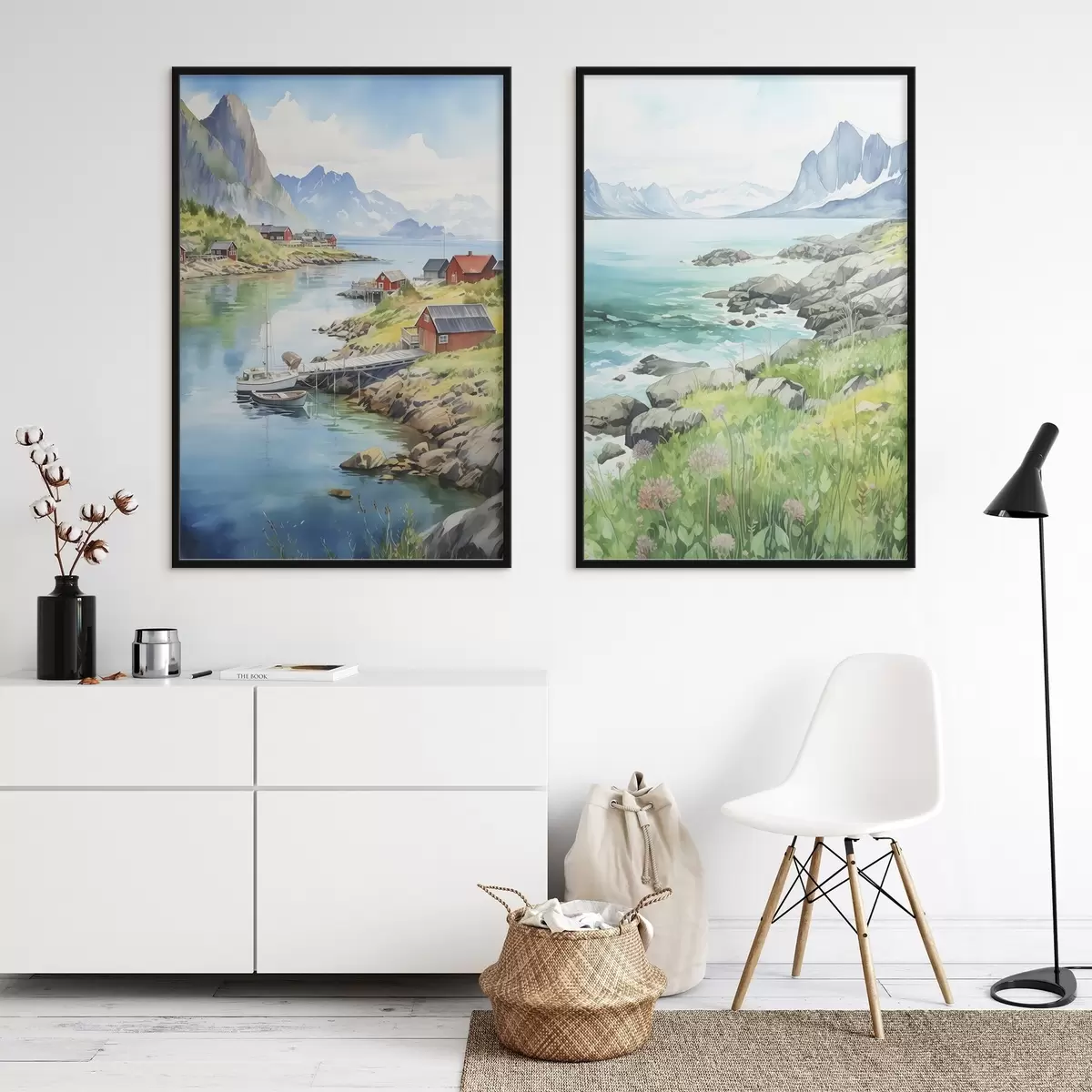 Poster Noorwegen natuur, Lofoten eilanden, zomer landschap, rode huizen, bergen, boten N° d00421