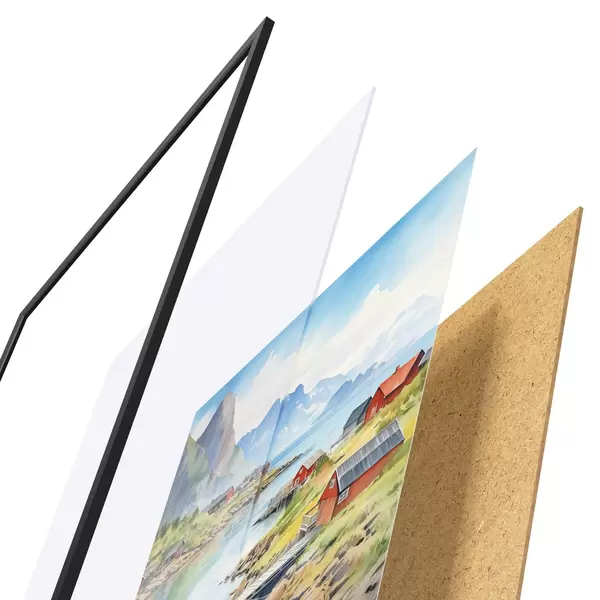 De poster bestaat uit een frame, plexiglas, geprinte afbeelding en spaanplaat achterkant. De poster kan meteen aan de muur worden gehangen dankzij de bevestigingen op de achterkant.