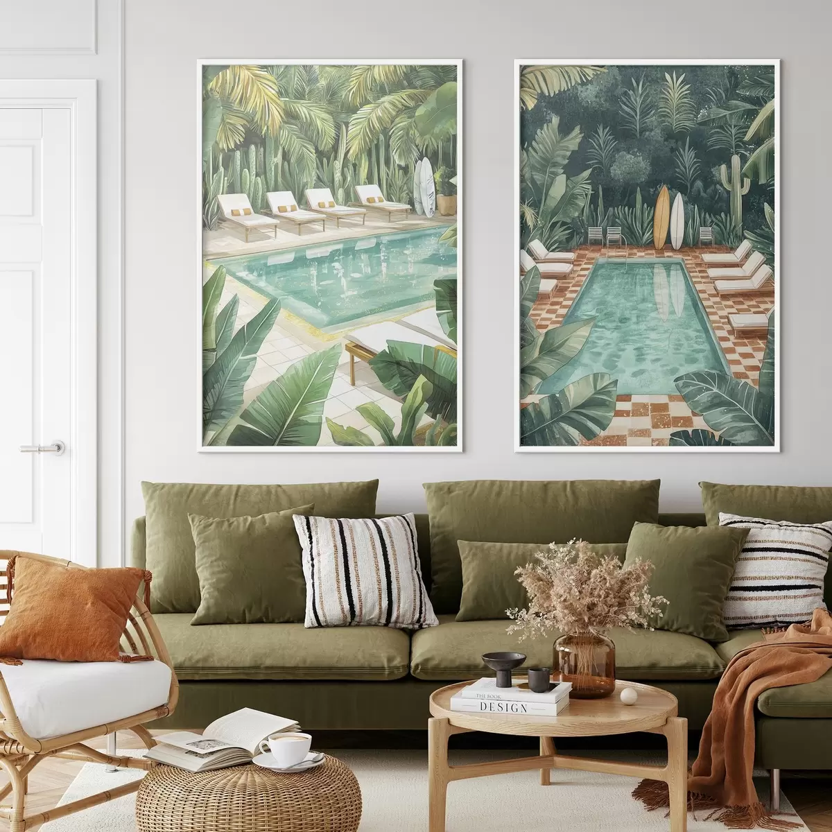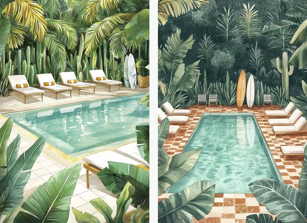Poster Zomerzwembad, vintage, tropisch bos, groen, palmbomen, aquarelstijl N° d00422