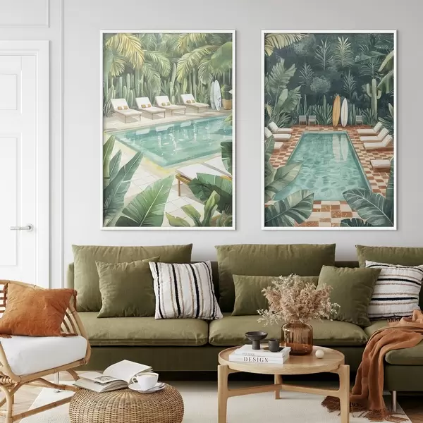 Poster Zomerzwembad, vintage, tropisch bos, groen, palmbomen, aquarelstijl d00422