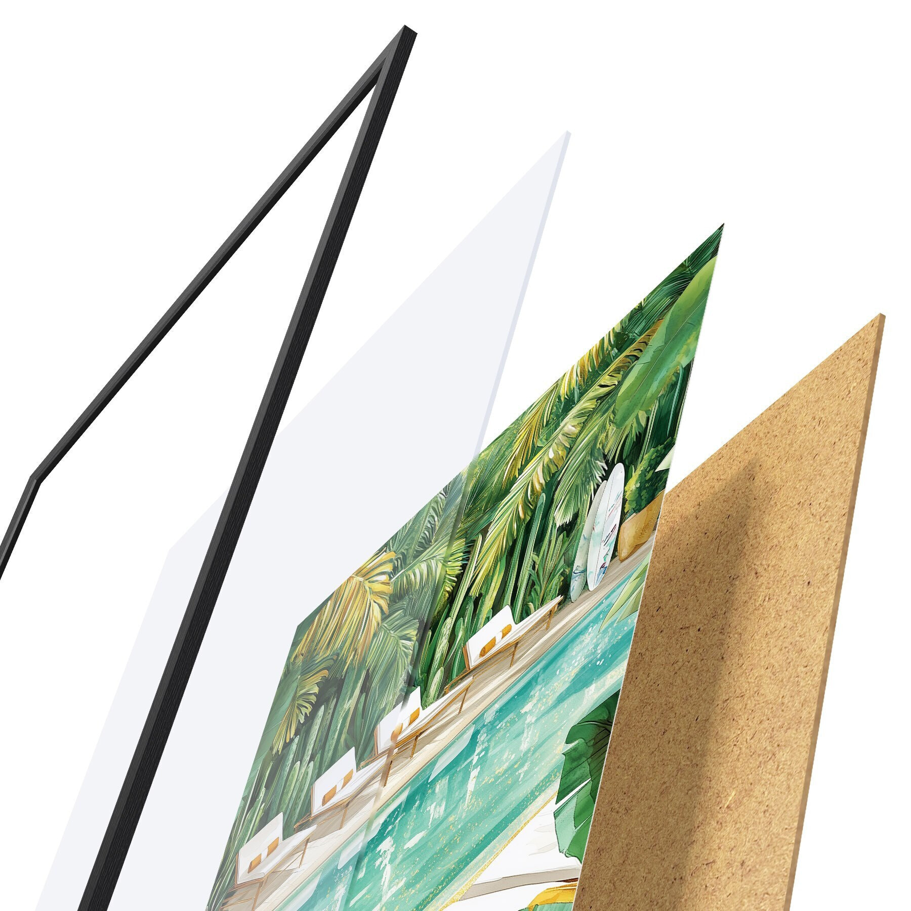 De poster bestaat uit een frame, plexiglas, geprinte afbeelding en spaanplaat achterkant. De poster kan meteen aan de muur worden gehangen dankzij de bevestigingen op de achterkant.