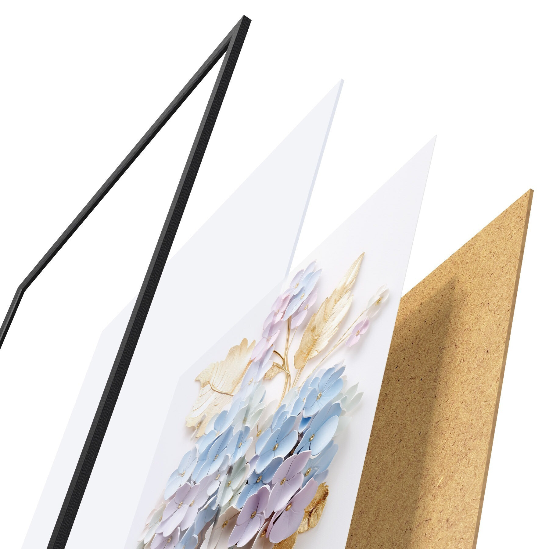 De poster bestaat uit een frame, plexiglas, geprinte afbeelding en spaanplaat achterkant. De poster kan meteen aan de muur worden gehangen dankzij de bevestigingen op de achterkant.