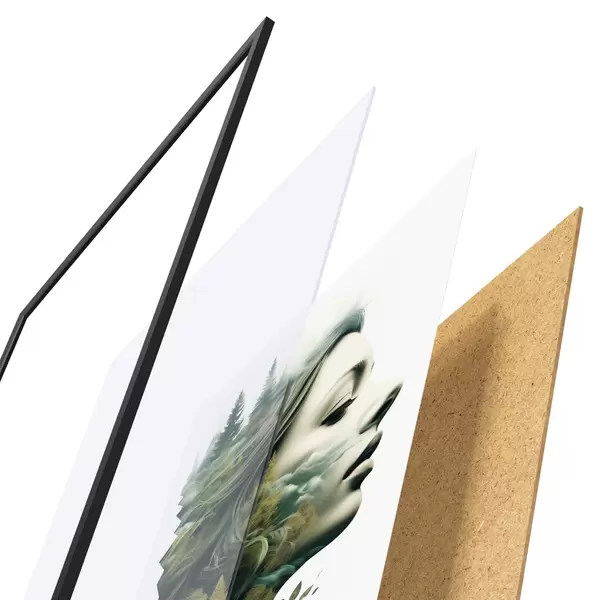 De poster bestaat uit een frame, plexiglas, geprinte afbeelding en spaanplaat achterkant. De poster kan meteen aan de muur worden gehangen dankzij de bevestigingen op de achterkant.