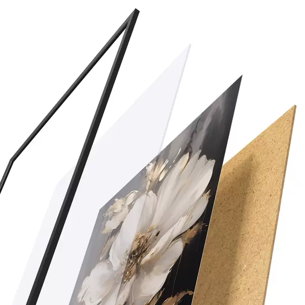 De poster bestaat uit een frame, plexiglas, geprinte afbeelding en spaanplaat achterkant. De poster kan meteen aan de muur worden gehangen dankzij de bevestigingen op de achterkant.