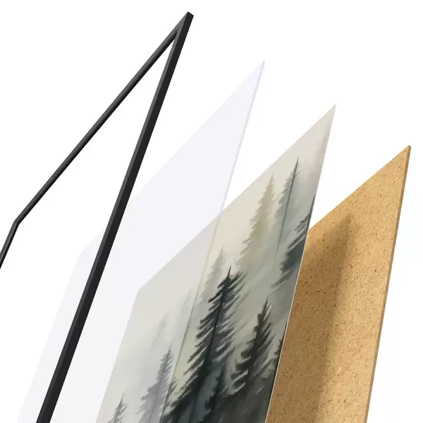 De poster bestaat uit een frame, plexiglas, geprinte afbeelding en spaanplaat achterkant. De poster kan meteen aan de muur worden gehangen dankzij de bevestigingen op de achterkant.