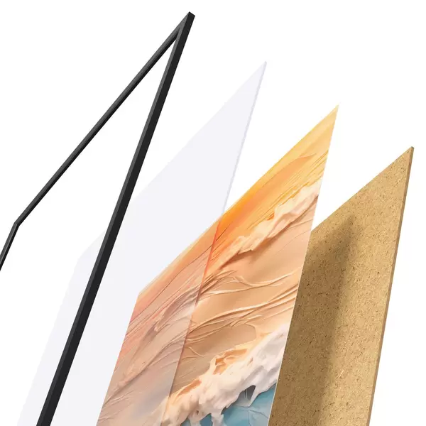 De poster bestaat uit een frame, plexiglas, geprinte afbeelding en spaanplaat achterkant. De poster kan meteen aan de muur worden gehangen dankzij de bevestigingen op de achterkant.