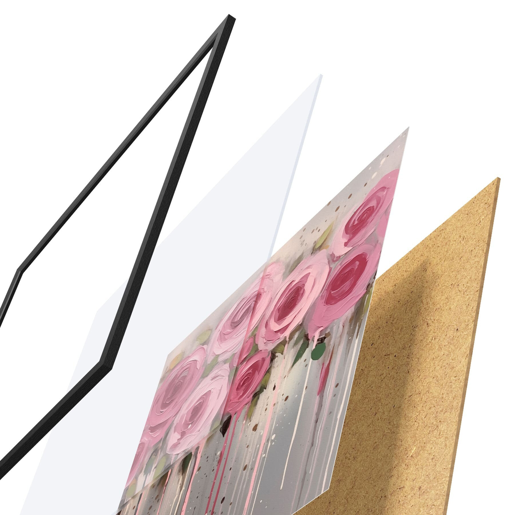 De poster bestaat uit een frame, plexiglas, geprinte afbeelding en spaanplaat achterkant. De poster kan meteen aan de muur worden gehangen dankzij de bevestigingen op de achterkant.
