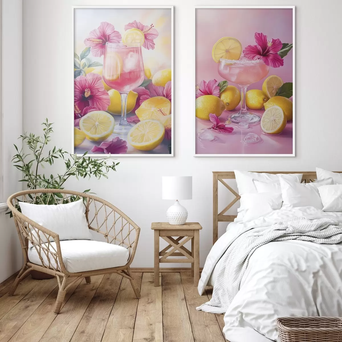Poster Cocktails met hibiscusbloemen en citroenen, zomer, sappig, aquarelstijl N° d00446
