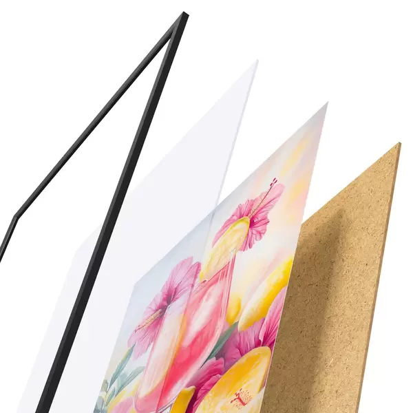 De poster bestaat uit een frame, plexiglas, geprinte afbeelding en spaanplaat achterkant. De poster kan meteen aan de muur worden gehangen dankzij de bevestigingen op de achterkant.