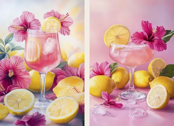 Poster Cocktails met hibiscusbloemen en citroenen, zomer, sappig, aquarelstijl N° d00446