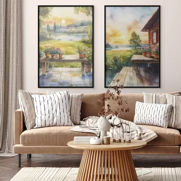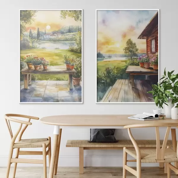 Poster Zomerdorp, zonsondergang, rustiek, bloemen, meer, aquarel stijl N° d00449