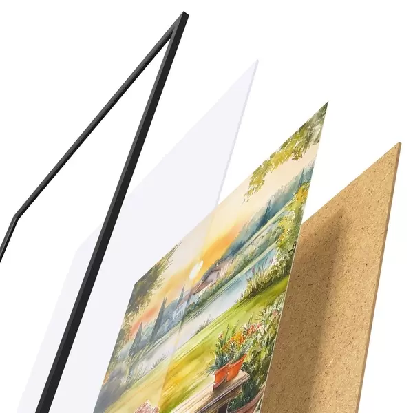De poster bestaat uit een frame, plexiglas, geprinte afbeelding en spaanplaat achterkant. De poster kan meteen aan de muur worden gehangen dankzij de bevestigingen op de achterkant.