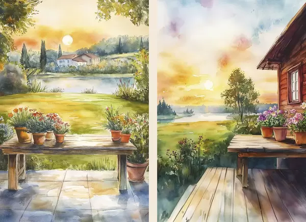 Poster Zomerdorp, zonsondergang, rustiek, bloemen, meer, aquarel stijl N° d00449