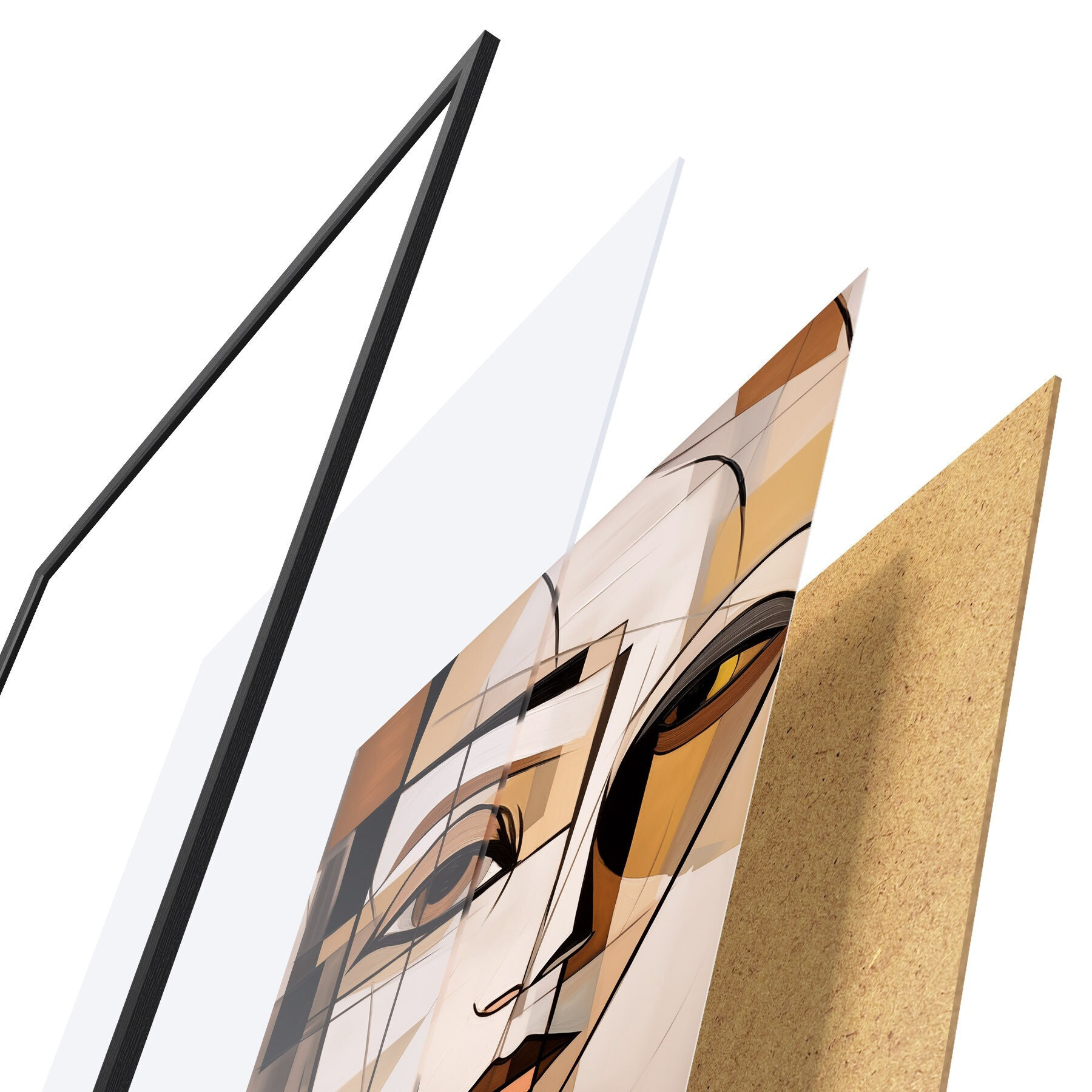 De poster bestaat uit een frame, plexiglas, geprinte afbeelding en spaanplaat achterkant. De poster kan meteen aan de muur worden gehangen dankzij de bevestigingen op de achterkant.