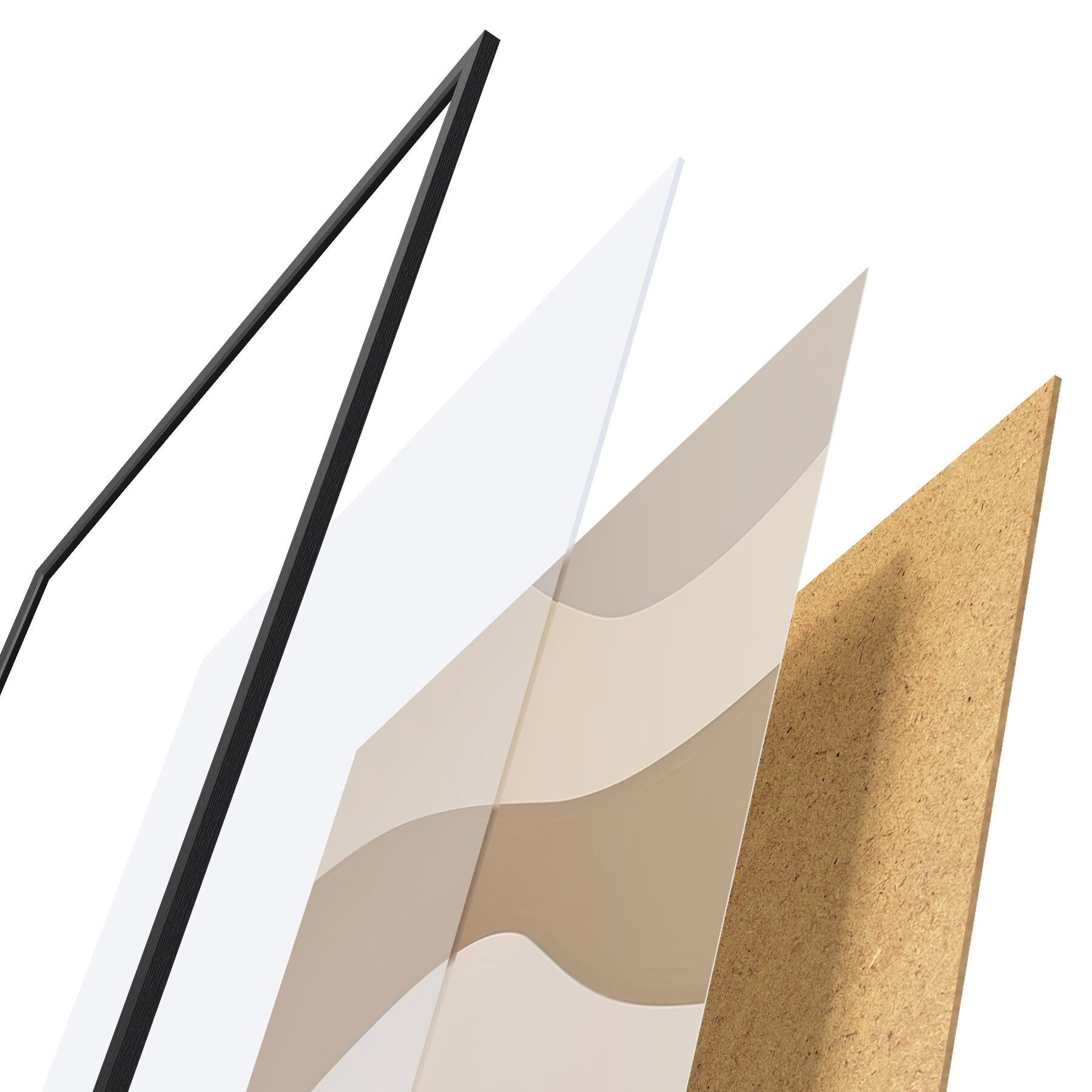 De poster bestaat uit een frame, plexiglas, geprinte afbeelding en spaanplaat achterkant. De poster kan meteen aan de muur worden gehangen dankzij de bevestigingen op de achterkant.