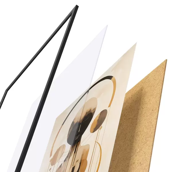 De poster bestaat uit een frame, plexiglas, geprinte afbeelding en spaanplaat achterkant. De poster kan meteen aan de muur worden gehangen dankzij de bevestigingen op de achterkant.