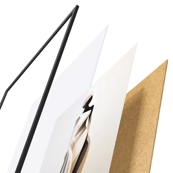 De poster bestaat uit een frame, plexiglas, geprinte afbeelding en spaanplaat achterkant. De poster kan meteen aan de muur worden gehangen dankzij de bevestigingen op de achterkant.