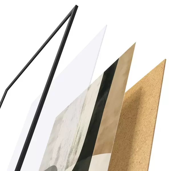 De poster bestaat uit een frame, plexiglas, geprinte afbeelding en spaanplaat achterkant. De poster kan meteen aan de muur worden gehangen dankzij de bevestigingen op de achterkant.