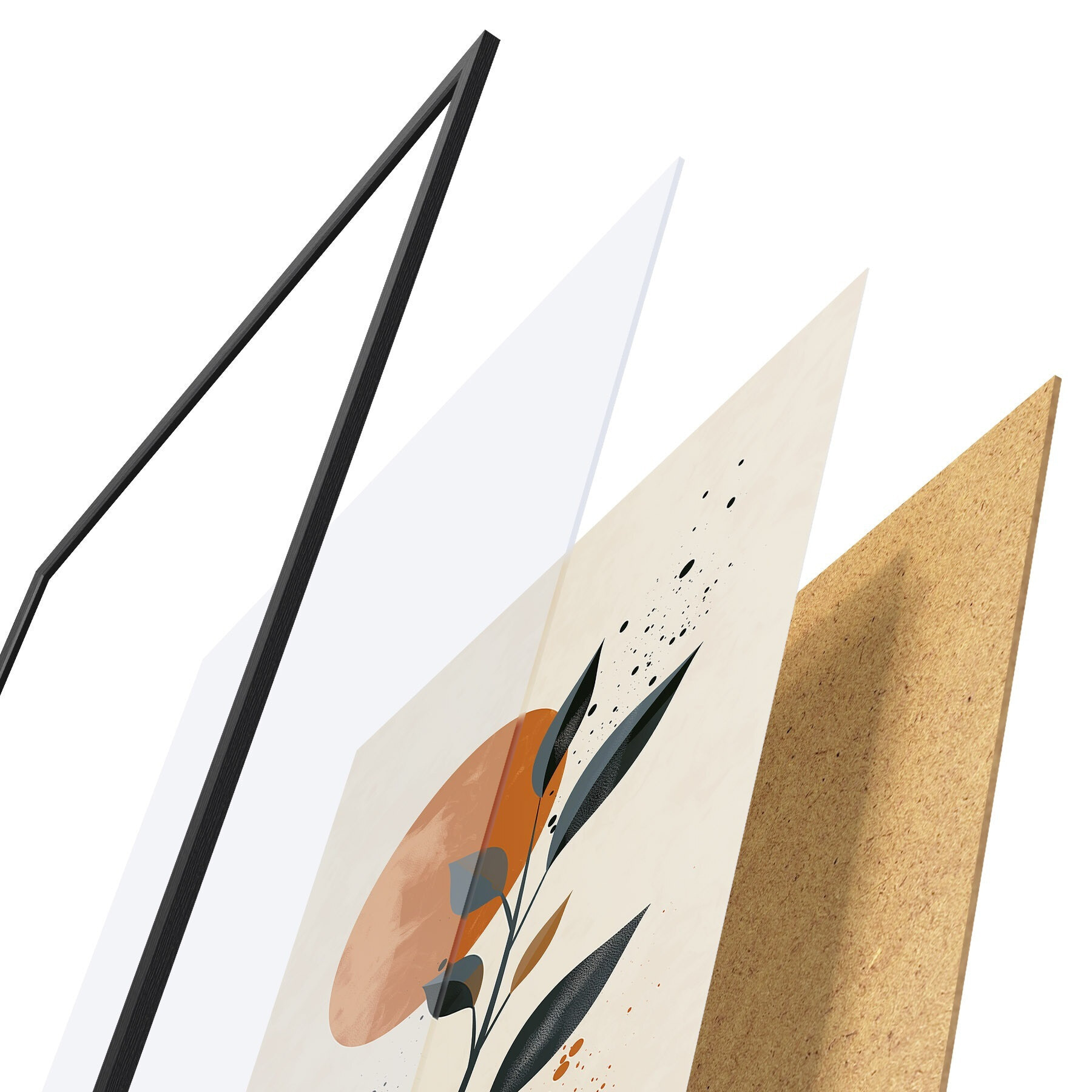 De poster bestaat uit een frame, plexiglas, geprinte afbeelding en spaanplaat achterkant. De poster kan meteen aan de muur worden gehangen dankzij de bevestigingen op de achterkant.