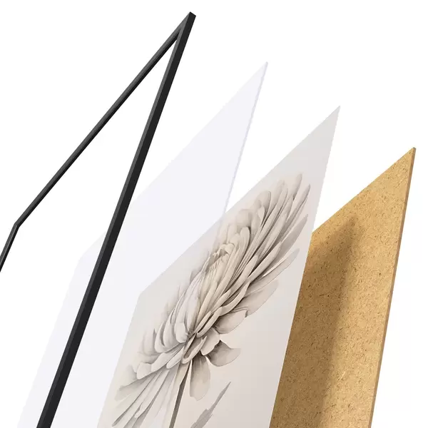 De poster bestaat uit een frame, plexiglas, geprinte afbeelding en spaanplaat achterkant. De poster kan meteen aan de muur worden gehangen dankzij de bevestigingen op de achterkant.