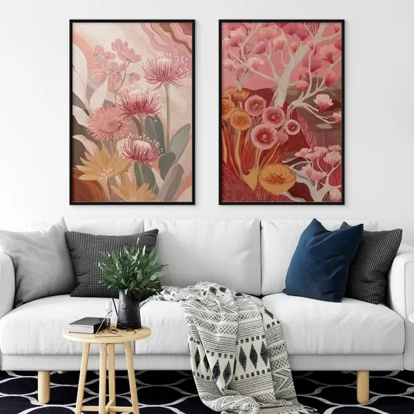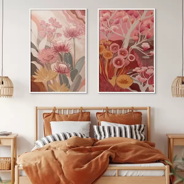 Poster Boho stijl bloemen, gedetailleerde tekening, bordeauxrode kleuren N° d00476