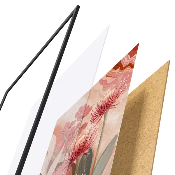 De poster bestaat uit een frame, plexiglas, geprinte afbeelding en spaanplaat achterkant. De poster kan meteen aan de muur worden gehangen dankzij de bevestigingen op de achterkant.
