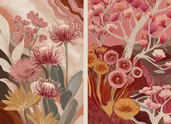 Poster Boho stijl bloemen, gedetailleerde tekening, bordeauxrode kleuren d00476