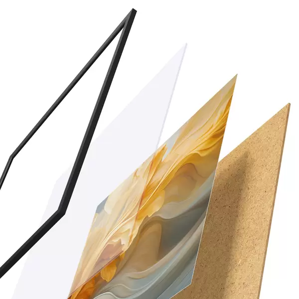 De poster bestaat uit een frame, plexiglas, geprinte afbeelding en spaanplaat achterkant. De poster kan meteen aan de muur worden gehangen dankzij de bevestigingen op de achterkant.