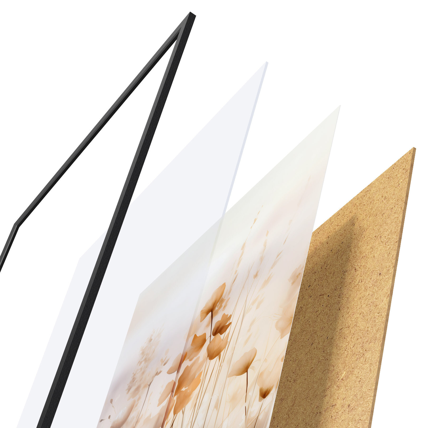 De poster bestaat uit een frame, plexiglas, geprinte afbeelding en spaanplaat achterkant. De poster kan meteen aan de muur worden gehangen dankzij de bevestigingen op de achterkant.