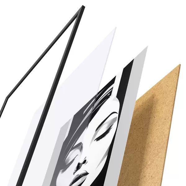 De poster bestaat uit een frame, plexiglas, geprinte afbeelding en spaanplaat achterkant. De poster kan meteen aan de muur worden gehangen dankzij de bevestigingen op de achterkant.