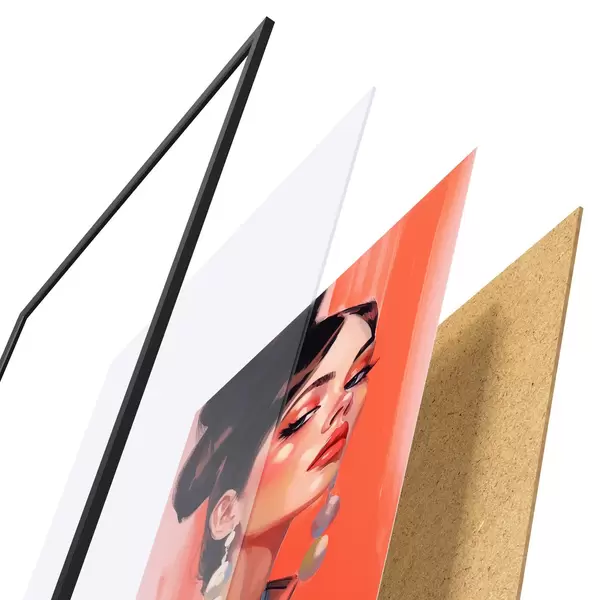De poster bestaat uit een frame, plexiglas, geprinte afbeelding en spaanplaat achterkant. De poster kan meteen aan de muur worden gehangen dankzij de bevestigingen op de achterkant.