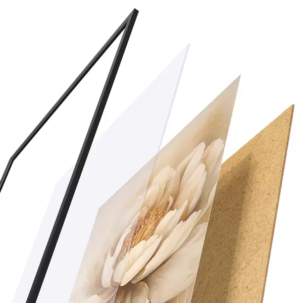 De poster bestaat uit een frame, plexiglas, geprinte afbeelding en spaanplaat achterkant. De poster kan meteen aan de muur worden gehangen dankzij de bevestigingen op de achterkant.
