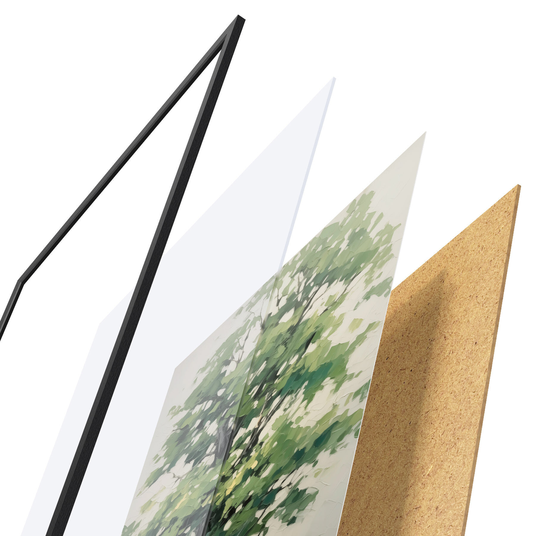 De poster bestaat uit een frame, plexiglas, geprinte afbeelding en spaanplaat achterkant. De poster kan meteen aan de muur worden gehangen dankzij de bevestigingen op de achterkant.