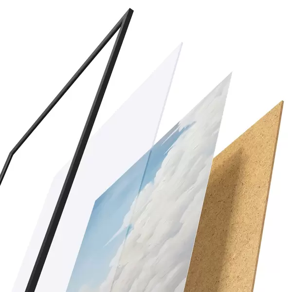 De poster bestaat uit een frame, plexiglas, geprinte afbeelding en spaanplaat achterkant. De poster kan meteen aan de muur worden gehangen dankzij de bevestigingen op de achterkant.