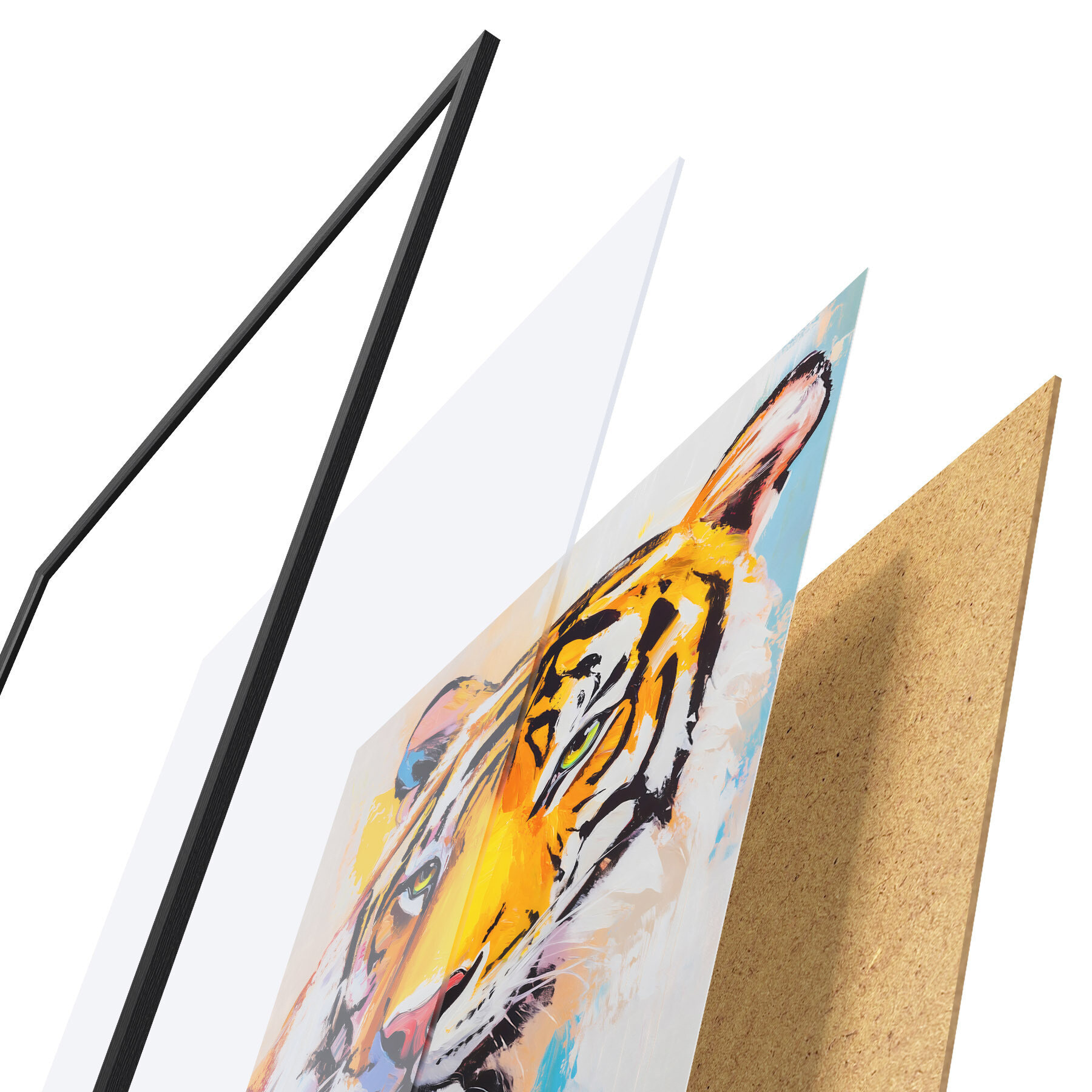 De poster bestaat uit een frame, plexiglas, geprinte afbeelding en spaanplaat achterkant. De poster kan meteen aan de muur worden gehangen dankzij de bevestigingen op de achterkant.