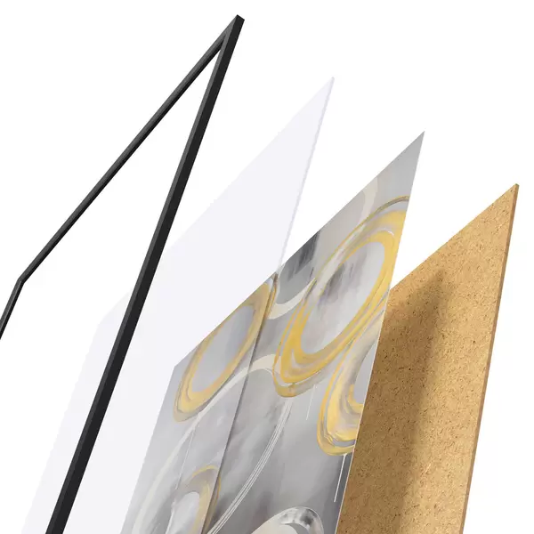De poster bestaat uit een frame, plexiglas, geprinte afbeelding en spaanplaat achterkant. De poster kan meteen aan de muur worden gehangen dankzij de bevestigingen op de achterkant.