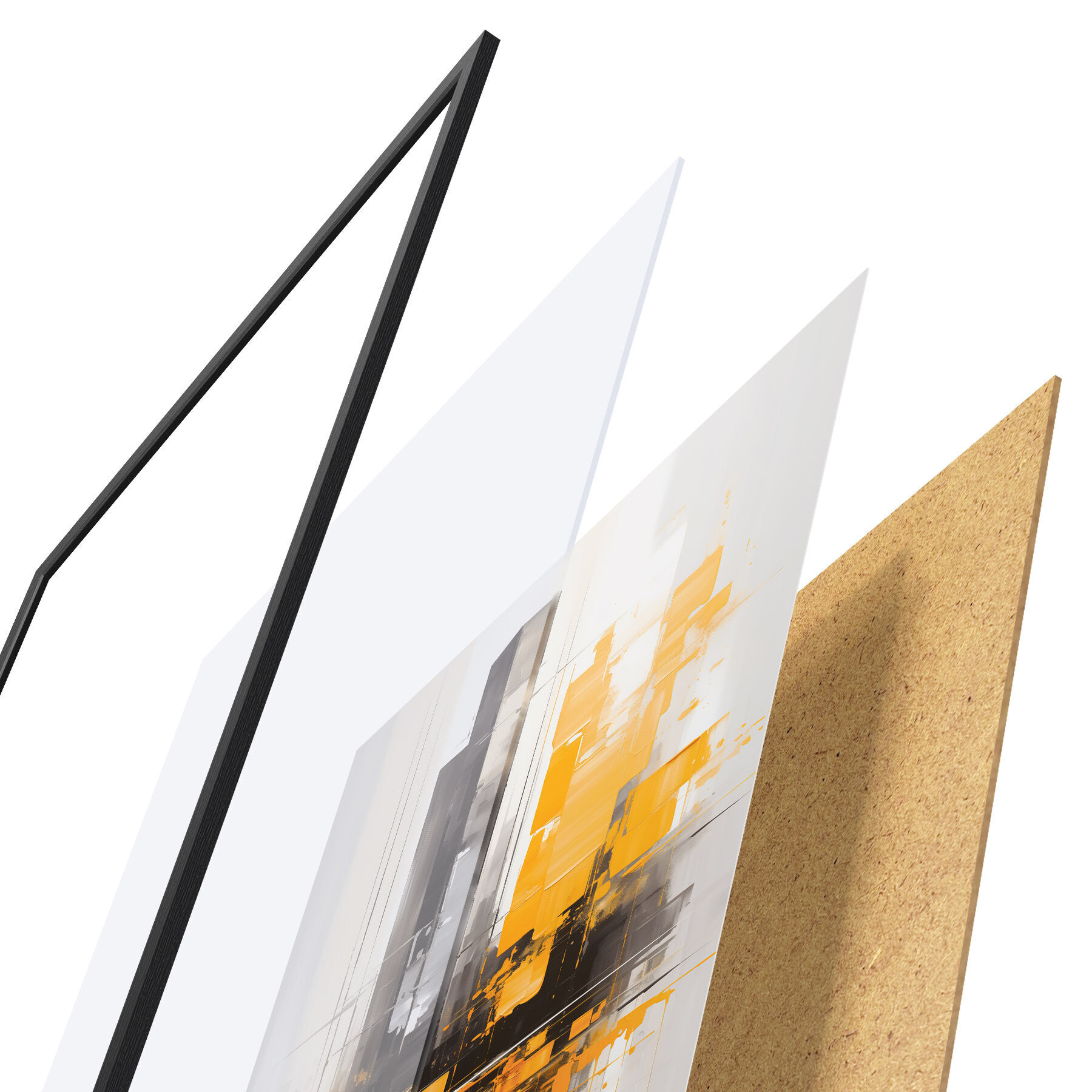 De poster bestaat uit een frame, plexiglas, geprinte afbeelding en spaanplaat achterkant. De poster kan meteen aan de muur worden gehangen dankzij de bevestigingen op de achterkant.