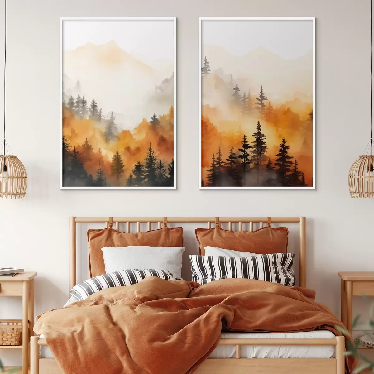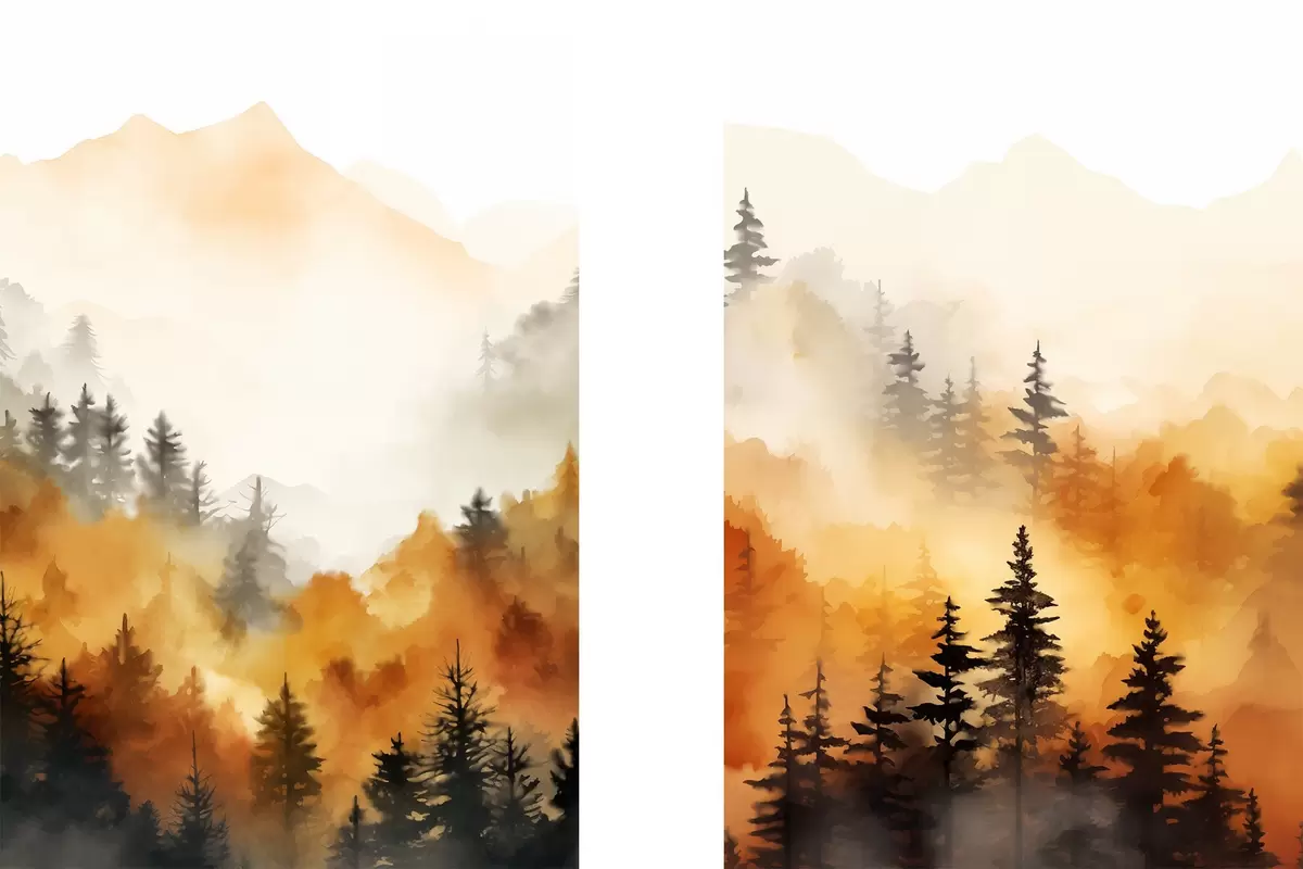 Poster Een landschap aquarel imitatie van een bos met hoge pijnbomen en bergen op de achtergrond N° d00519