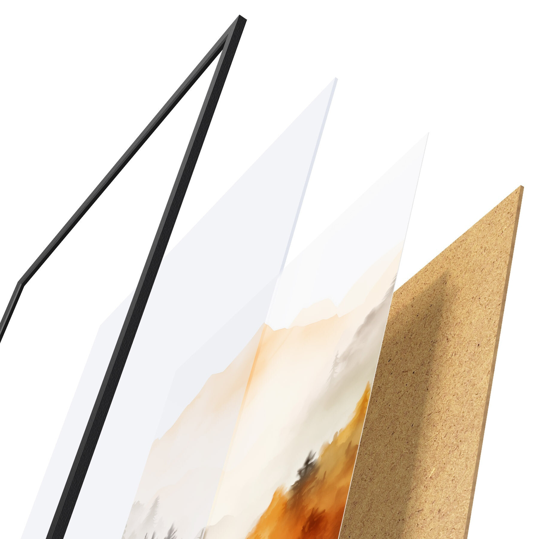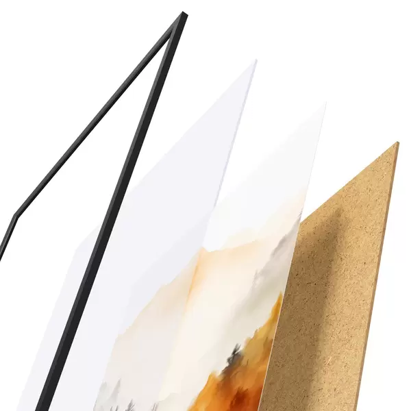 De poster bestaat uit een frame, plexiglas, geprinte afbeelding en spaanplaat achterkant. De poster kan meteen aan de muur worden gehangen dankzij de bevestigingen op de achterkant.