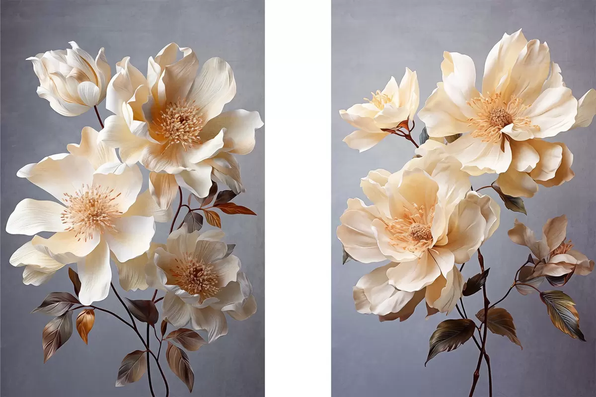 Poster Gestructureerde bloemen met oranje stampers en oranje bladeren op grijze achtergrond, zacht licht, elegant, gedetailleerd, realistisch N° d00525